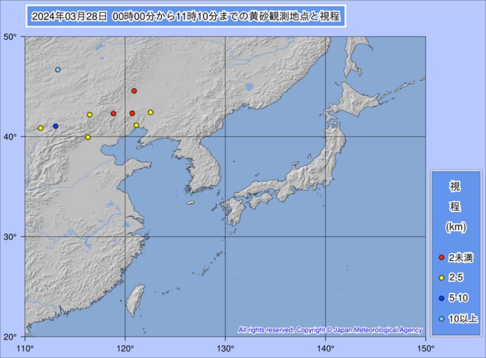 この黄砂は中国で発生したもので、28日は北京など中国北東部で観測されており、水平方向の見通し(視程)が2キロ未満とかなり悪くなっている所もあります。