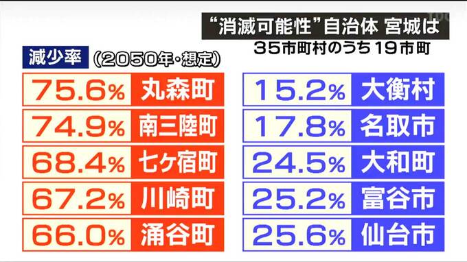 県内では、35市町村のうち54%にあたる19の市町が「消滅可能性自治体」となっています。減少率が最も高いのが丸森町で75.6%、次いで南三陸町が74.9%などとなっています。一方、減少率が最も低かったのは大衡村で15.2%。次いで名取市が17.8%、仙台市は5番目という結果でした。