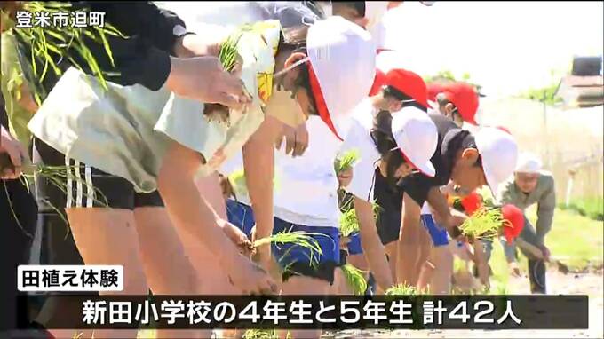 田植えを体験したのは、登米市の新田小学校の4年生と5年生合わせて42人です。