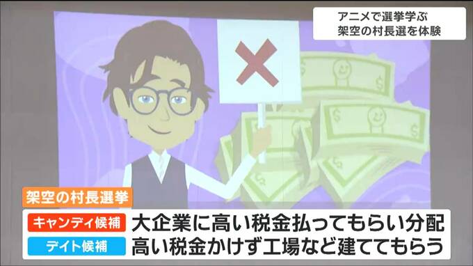 多賀城東小学校で行われた授業には、6年生71人が参加しました。架空の村長選挙を題材にしたアニメでは、村の大企業に高い税金を払ってもらいみんなで分配するというキャンディ候補と高い税金はかけず、もっと収益をあげてもらうというデイト候補のどちらに投票するか、みんなで議論しました。