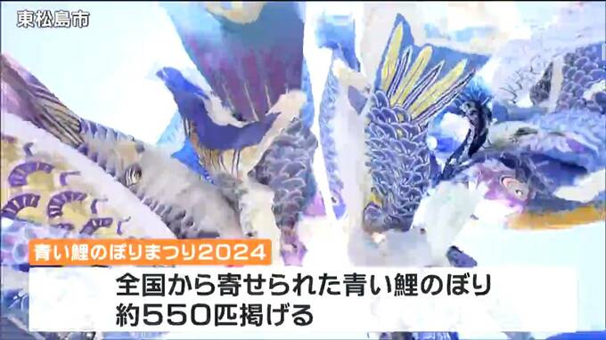 東松島市では鯉のぼりを掲げる催しが開かれ全国から寄せられたおよそ550匹の青い鯉のぼりが青空を泳ぎました。