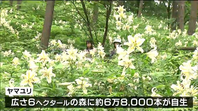 ヤマユリは広さ6ヘクタールの森に古くから自生していて、いまでもおよそ6万8000本が育っています。管理事務所によりますと、今年は、例年とほぼ同じ7月4日に咲き始め、全体の6割ほどが咲き揃いました。