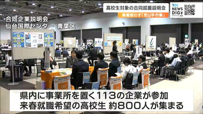 仙台国際センターで開かれた合同企業説明会には、宮城県内に事業所を置く113の企業が参加し、来年3月に卒業予定で就職希望の高校生およそ800人が集まりました。