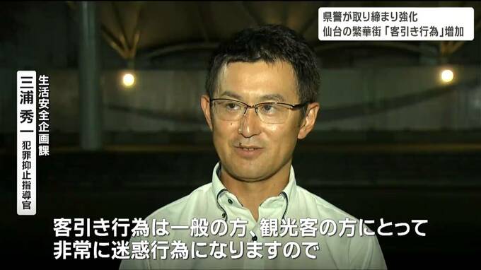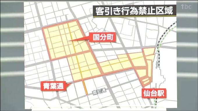 仙台市が指定している客引きの禁止区域では、国分町周辺のほか仙台駅周辺も禁止区域になっていますが、あおば通より南側は対象にはなっていません。この区域では、居酒屋やカラオケ店の客引き行為が多く行われています。これらの行為は違法ではありませんが、県警や市には苦情が寄せられていて客にしつこく付きまとうなどの行為が確認された場合は、警告や検挙の対象になる場合もあるということです。