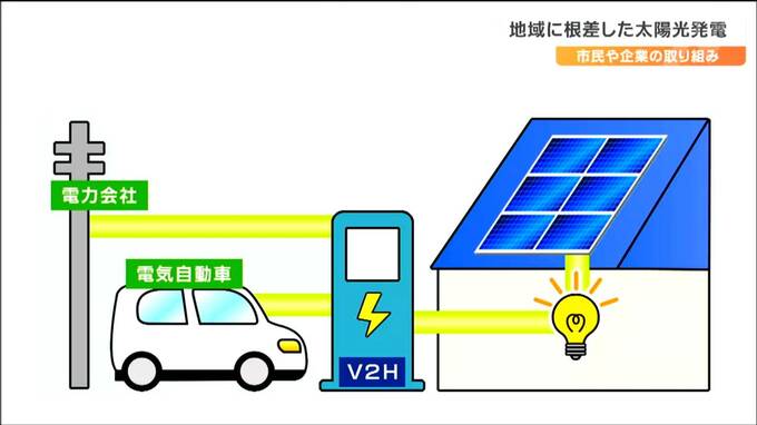 仕組みはこうです。家と電気自動車、それに電力会社からそれぞれ電気を送るラインがつながっています。日中は、太陽光で家の電気を賄い、余った分は電気自動車にためたり電力会社を通じ売電したりします。夜や天候の悪い日は、電気自動車にためた電気や電力会社から買った電気を家で使います。電力会社に支払う電気料金は売電で相殺できるため、実質、電気代はかからないと言います。