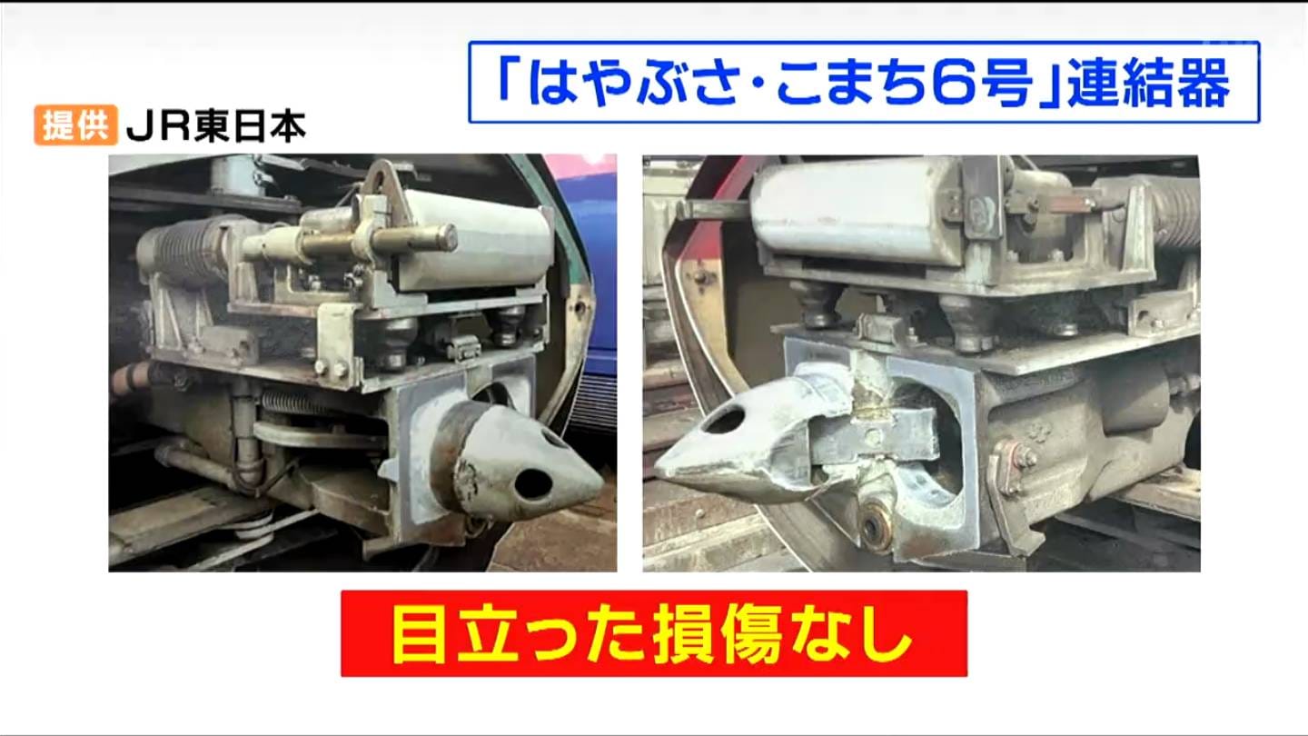 そして、こちらはトラブルがおきたはやぶさ・こまち6号の連結部分の写真です。目立った損傷は見当たらなかったということでJRは今のところ、原因はわかっていないと説明しています。今後、ほかの新幹線車両でも連結部分の目視点検を進めるということです。