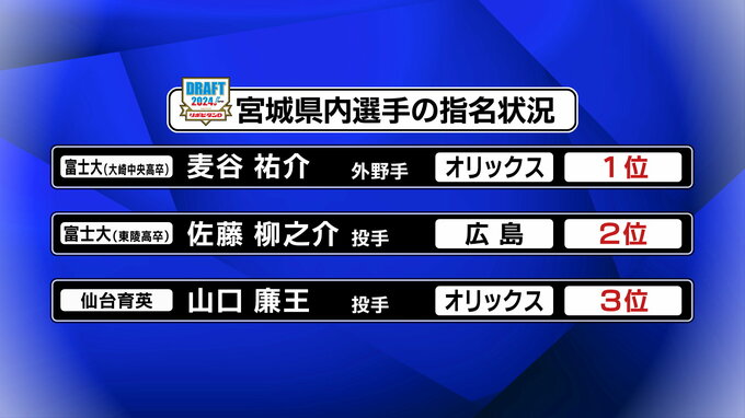 宮城県ゆかりの選手では、大崎中央高校出身・富士大学の麦谷祐介(むぎたに ゆうすけ)外野手がオリックスから1位指名、同じく富士大で東陵高校出身の佐藤柳之介(りゅうのすけ)投手が広島から2位指名を受けています。