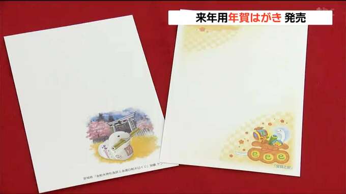 県内で販売される年賀はがきは9種類で、宮城県版には干支の「蛇」にちなみ、岩沼市の金蛇水(かなへびすい)神社の鳥居が描かれています。