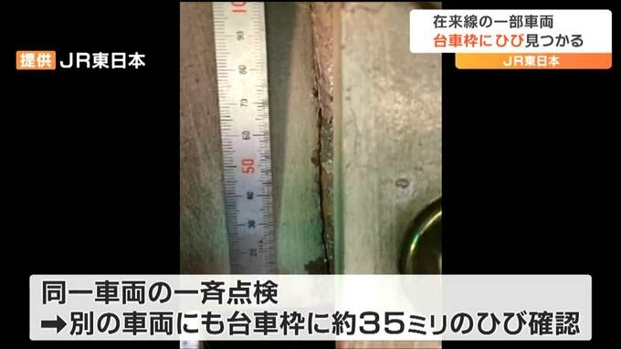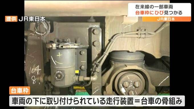 11月4日の定期検査で、このうち1編成におよそ110ミリのひびが確認されました。その後、同一車両の一斉点検を実施したところさらに、8日、別の車両にも台車枠におよそ35ミリのひびが見つかりました。台車枠は、車両の下に取り付けられている走行装置、台車の骨組みで、JR東日本はひびが見つかった車両の使用を停止し原因を究明しています。