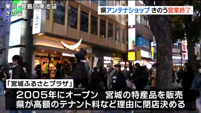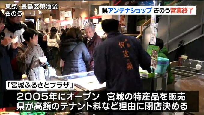 JR池袋駅の近くにある「宮城ふるさとプラザ」は2005年にオープンし、宮城の特産品を販売してきましたが県は、高額なテナント料などを理由に閉店を決め15日、最後の営業日を迎えました。店内は閉店を惜しむ人たちで混雑していました。