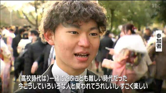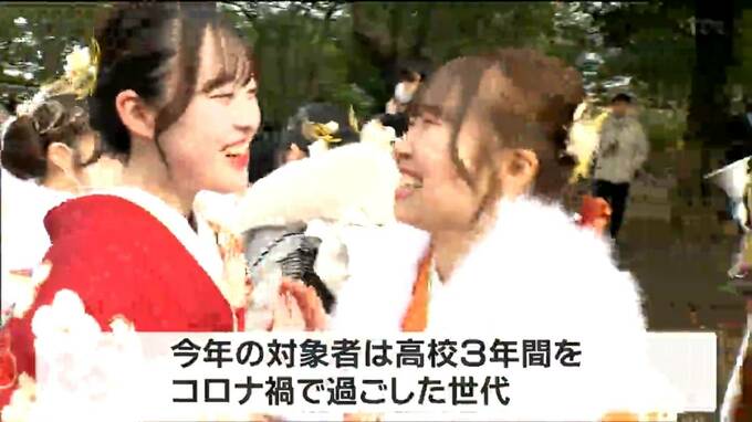 今年の対象者は高校時代の3年間をコロナ禍で過ごした世代で、参加者は久々に会う友人との再会を喜びながら写真を撮るなどし、て互いの二十歳の門出を祝っていました。