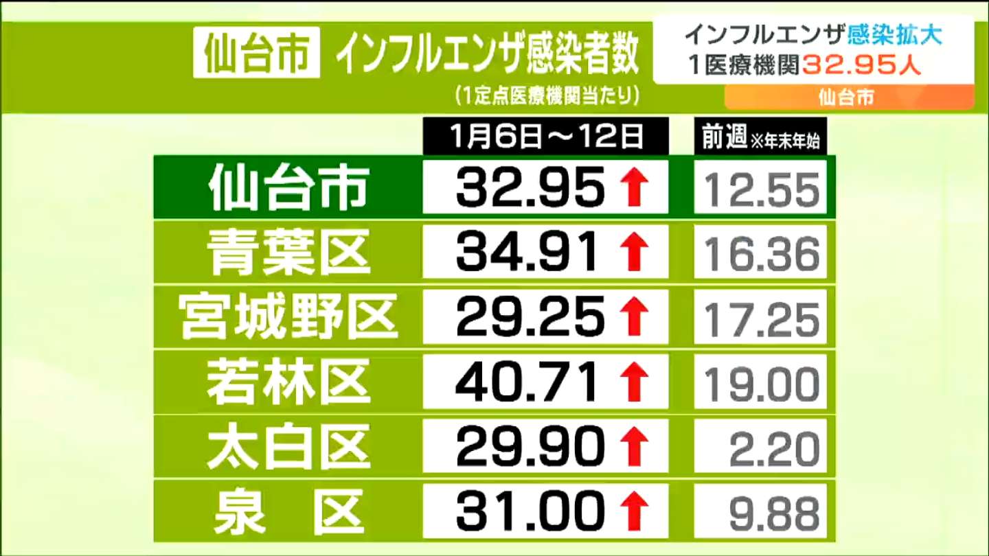 仙台市によりますと1月12日までの1週間に仙台市内の44定点医療機関でインフルエンザと診断された人は1450人で年末年始で医療機関が休みだった前の週に比べ898人増えました。