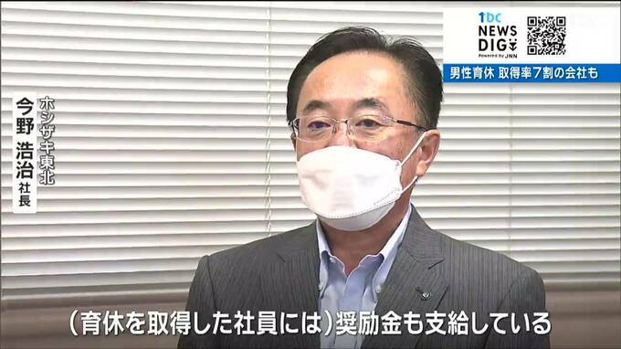 「(男女とも)子どもが生まれたら、まず総務窓口に連絡をもらう。そのときに育休をとってもらうように促す。(育休を取得した社員には)奨励金も支給している」