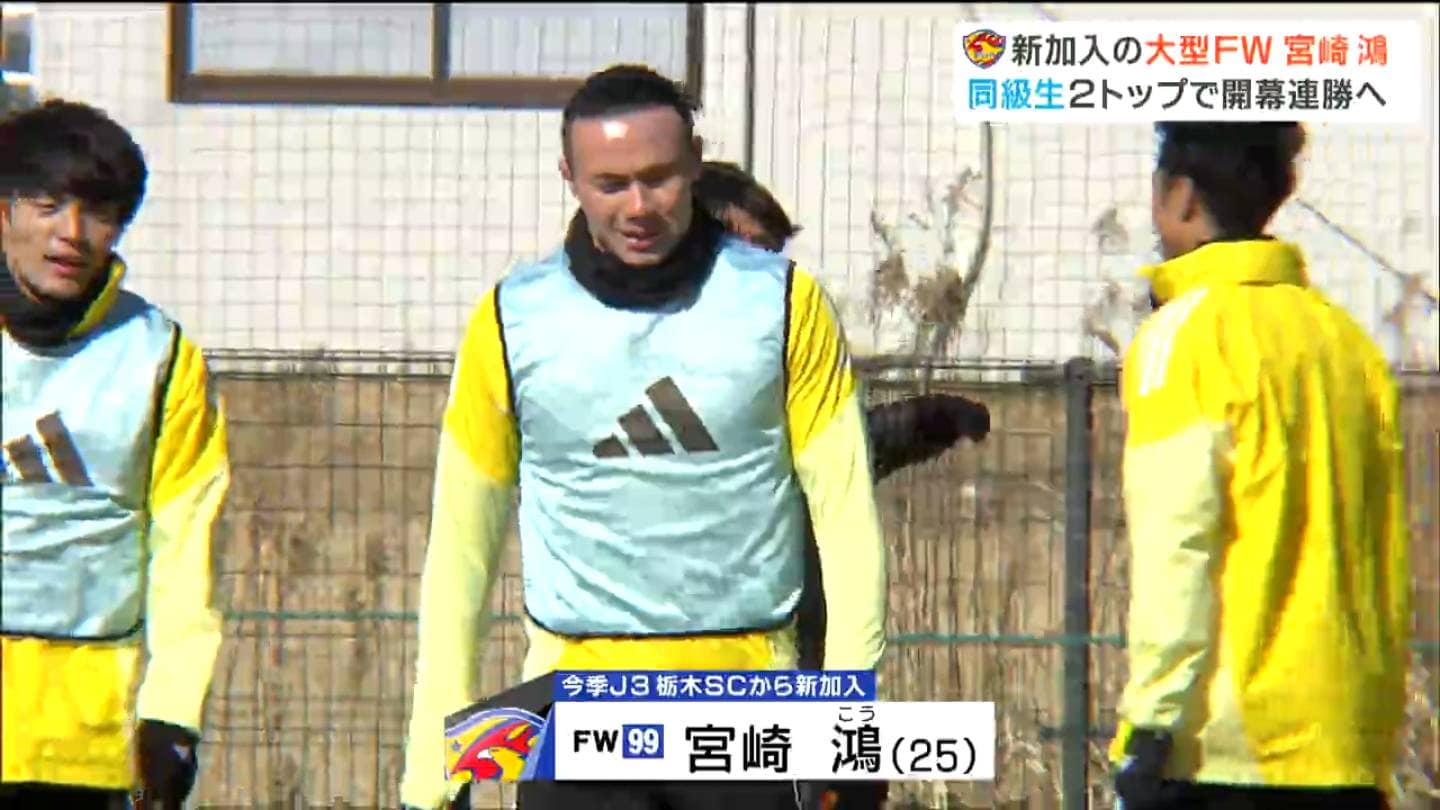 長髪にオールバックのこの選手。今シーズン、栃木SCから加入した宮崎鴻選手です。武器は184センチ、82キロの恵まれた体格を生かした迫力のあるプレー。フィジカルで相手選手を弾き飛ばします。開幕戦では新加入ながらスタメン出場。ロングボールを胸で収め強引にシュートまで持ち込み…パスに抜け出し決定的なシーンもつくり相手を脅かし続けました。