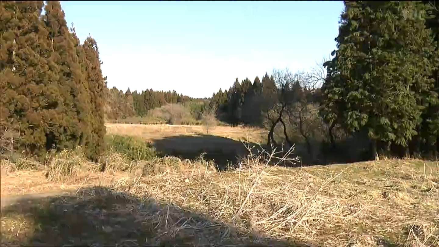 「こちら右手。この辺りから向こうのスギの木の手前まで試験栽培する場所になる」