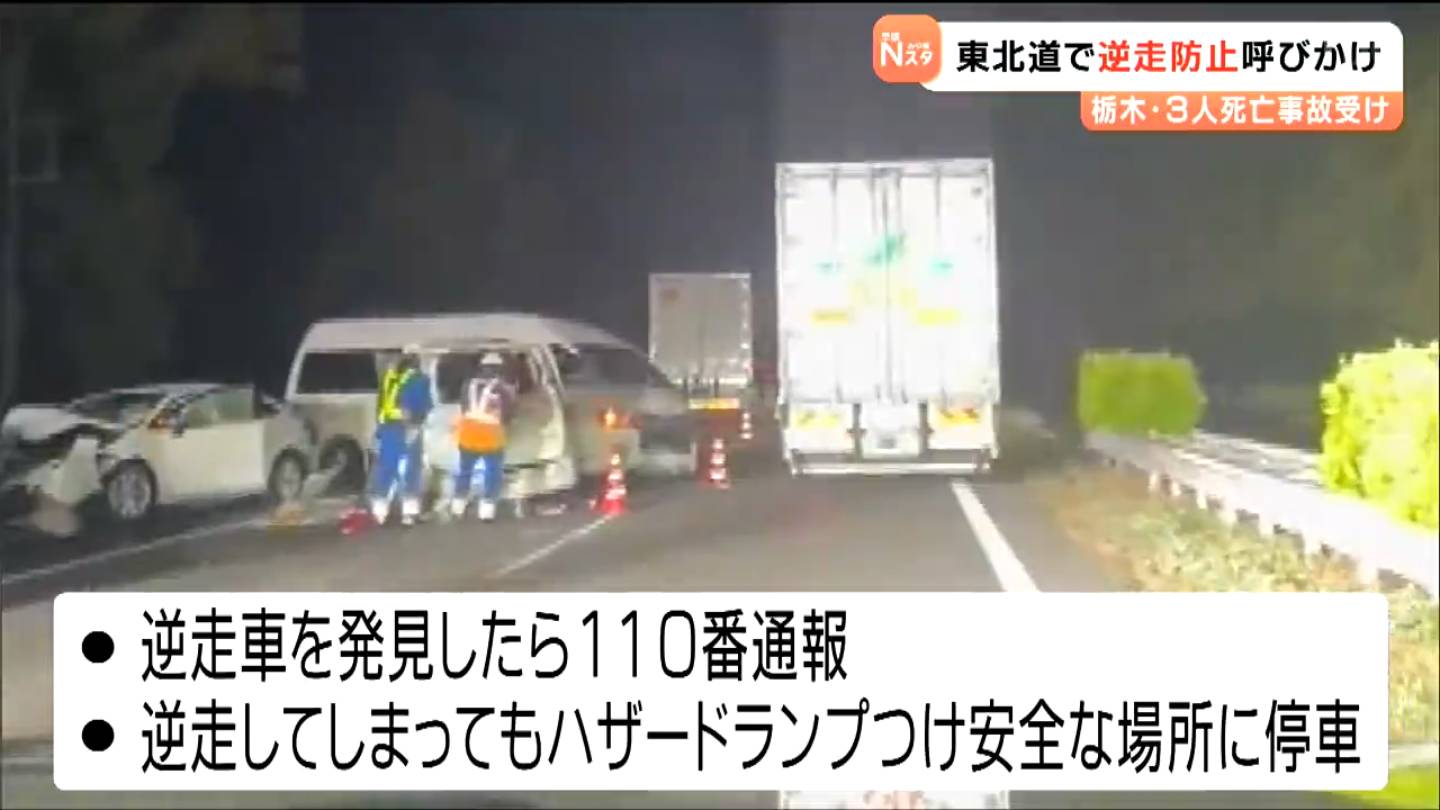 東北道では、4月26日、栃木県内で逆走した車が、別の乗用車と正面衝突するなどしてあわせて3人が死亡する事故がありました。この事故を受け、高速道路の利用者が増えるゴールデンウイークに合わせてキャンペーンが行われました。