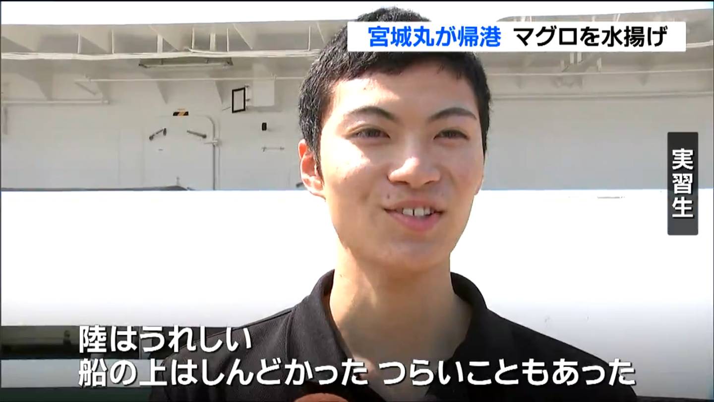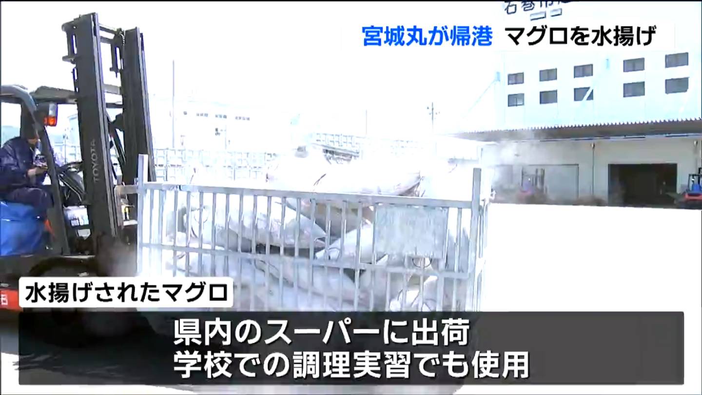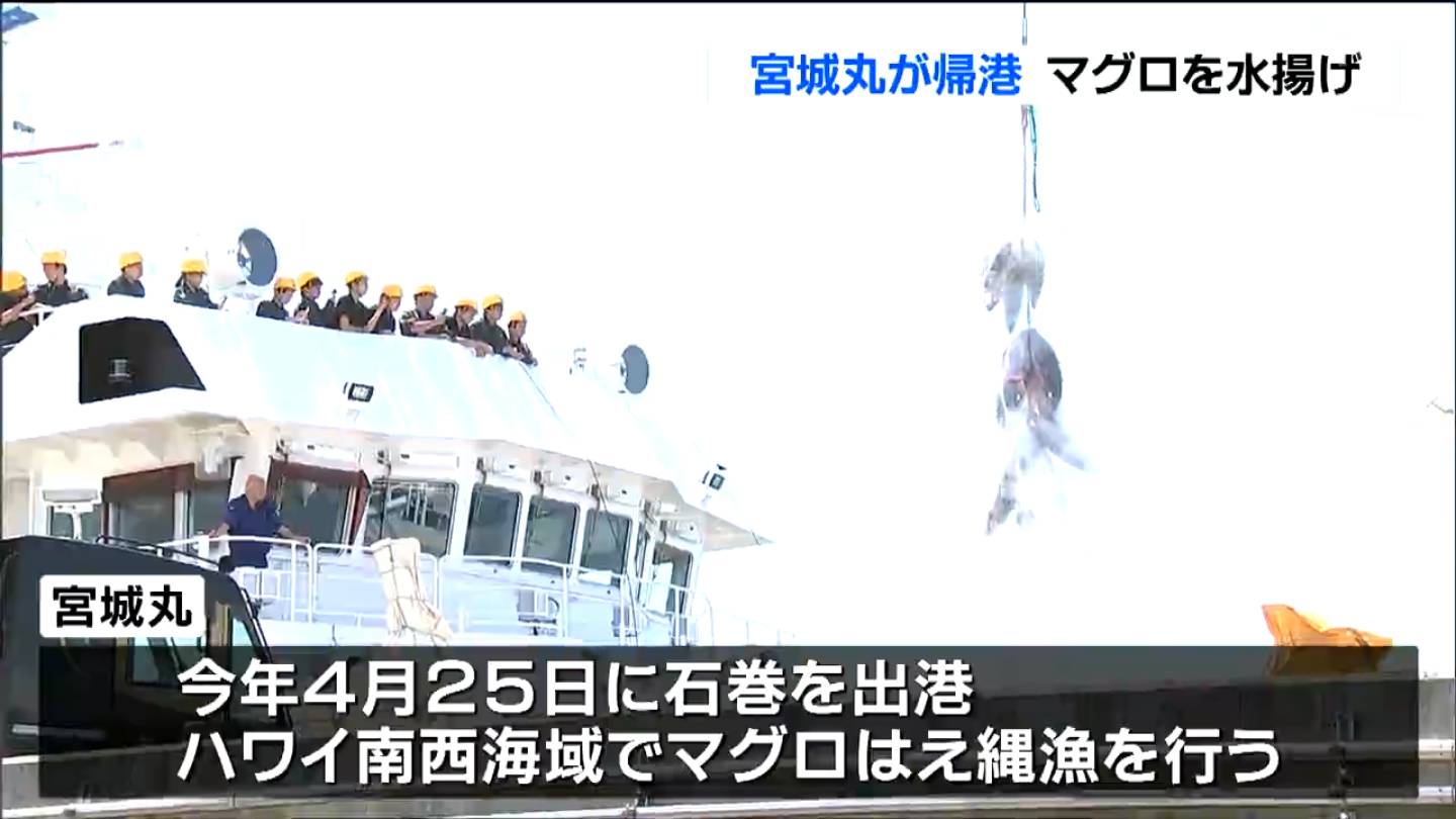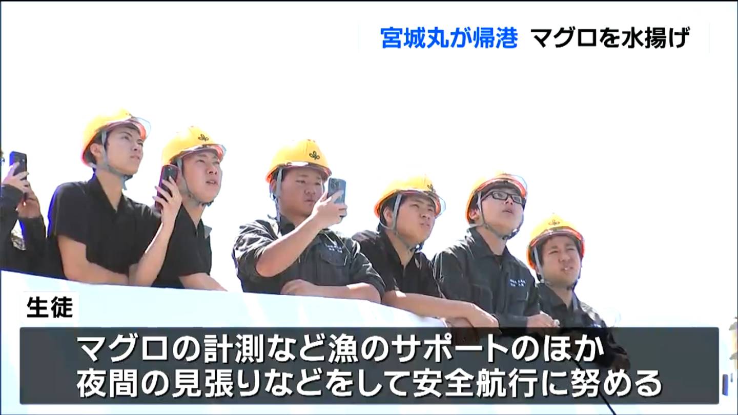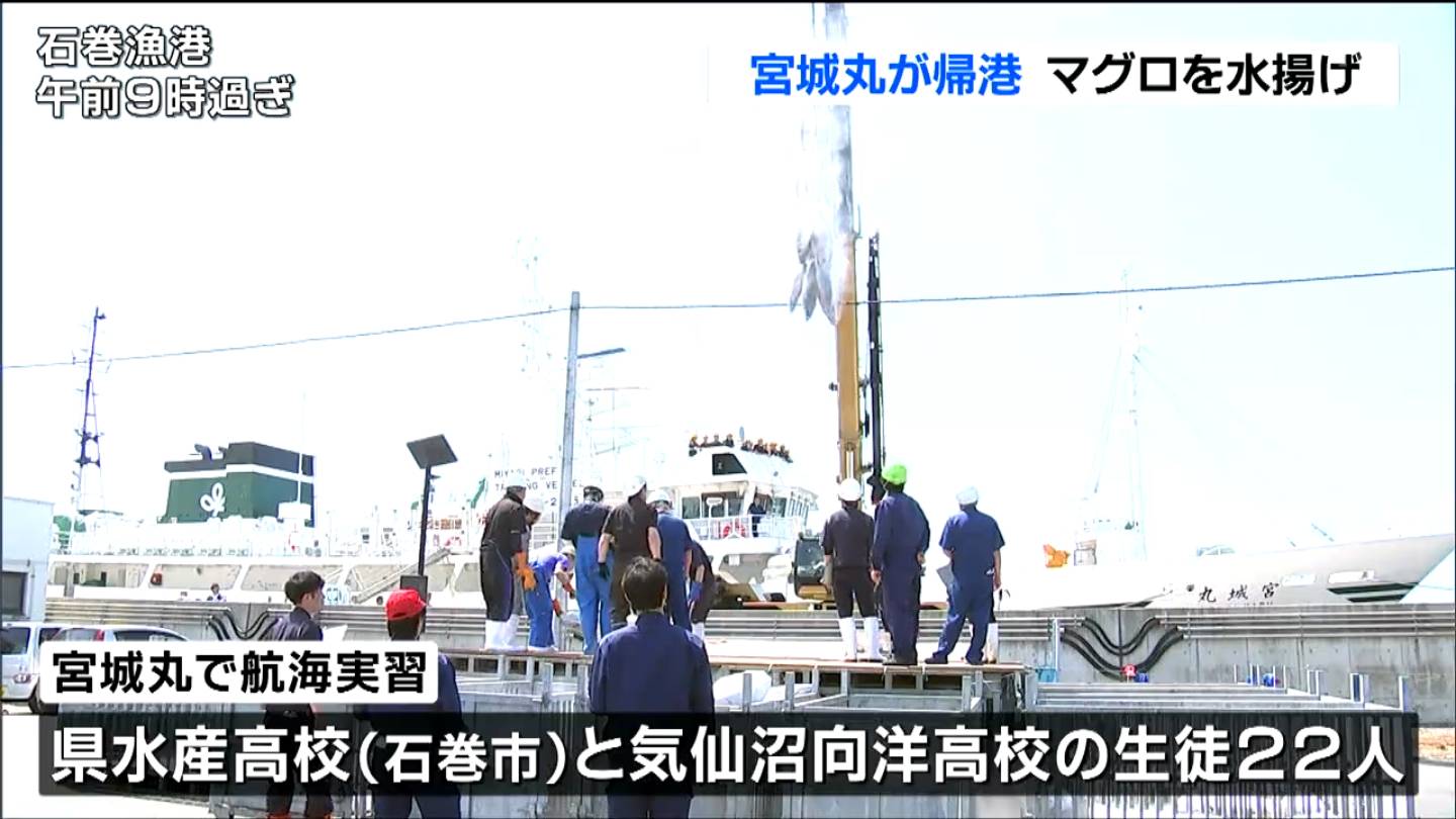 宮城県の実習船「宮城丸」で航海実習を行ってきた水産高校の生徒たちが、20日朝石巻漁港に戻り、実習で獲ったマグロを水揚げしました。