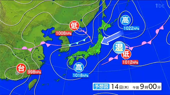 14日は、北海道東方の海上に高気圧が移動することで、宮城県内は東よりの湿った空気の影響を受けやすくなります。湿った空気が奥羽山脈にぶつかり、宮城県側に雲が溜まりやすくなる見込みです。