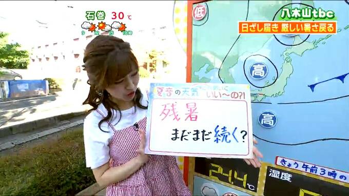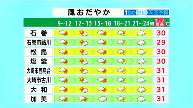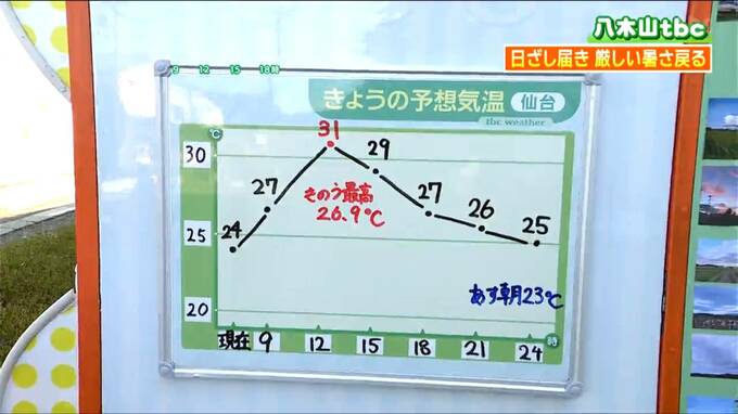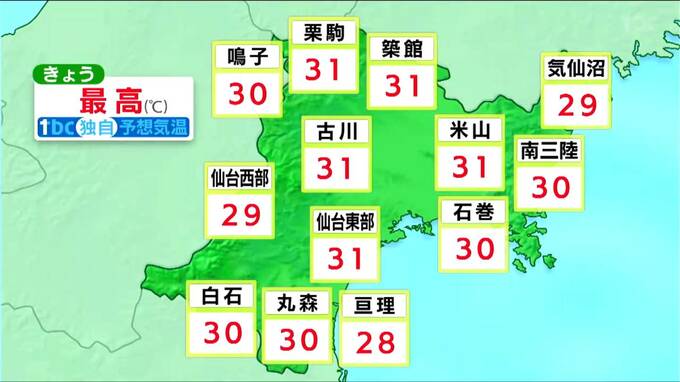 仙台の気温は、31℃まで上昇する予想です。夜間の気温低下もゆっくりで、明日の朝の最低気温は23℃と、今朝よりやや高くなりそうです。