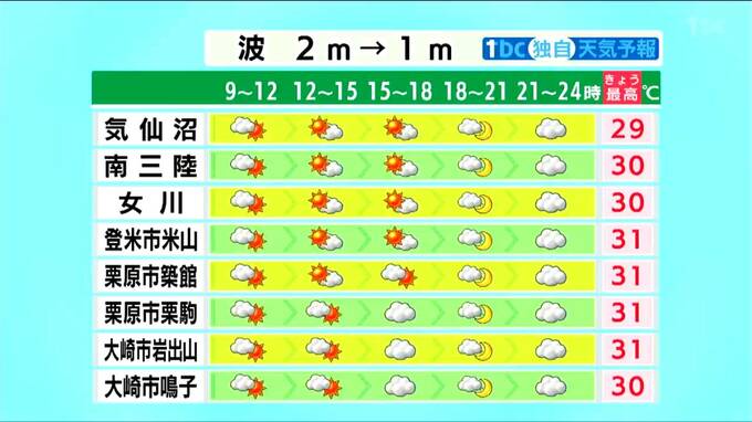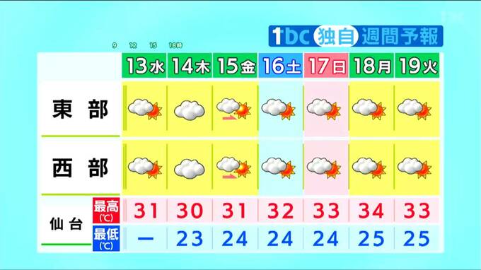 涼しく感じられた12日とは打って変わり、13日は宮城県内各地で日差しが十分に届き、厳しい暑さが戻ってきます。午後からは湿度も高くなるため、熱中症への十分な注意が必要です。