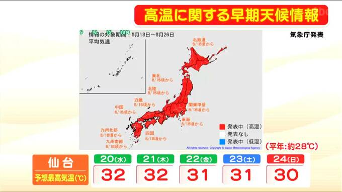 気象庁は12日に高温に関する早期天候情報を発表しました。これによると、8月18日頃から気温が平年よりかなり高くなる見込みです。30℃以上の暑さが8月後半になっても続き、残暑が長引きそうです。