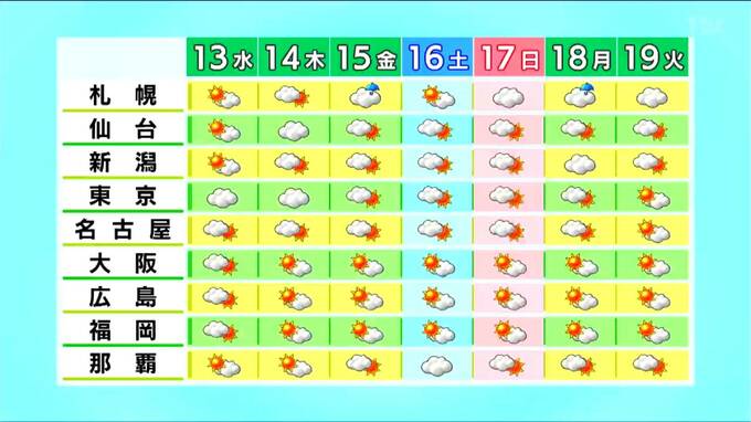 全国的には、太平洋高気圧が強まることで晴れ間が広がり、暑さが厳しくなる予想です。一方、札幌は気圧の谷や前線の影響で雲が広がりやすく、雨の降る日もありそうです。熱中症対策を十分に行い、厳しい暑さに備えましょう。