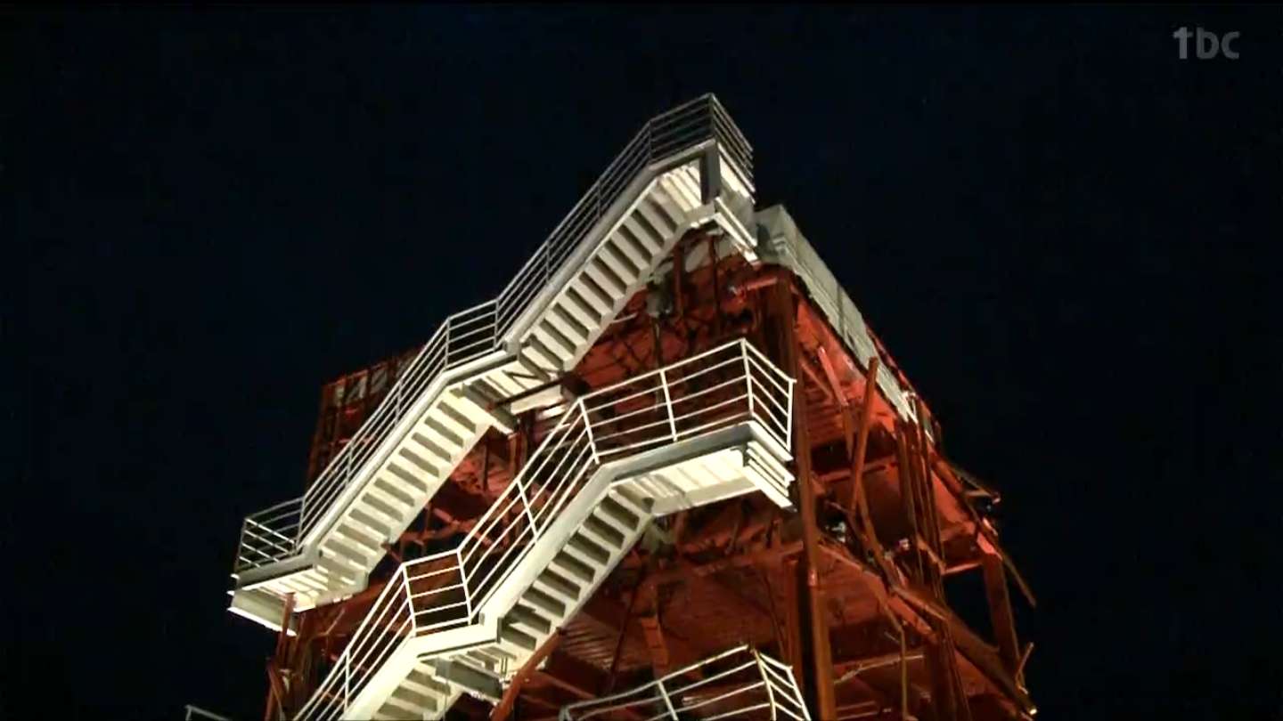 日が暮れてくると庁舎にあかりが灯されて骨組みだけが残った建物を柔らかな光が包みました。