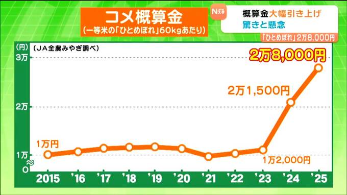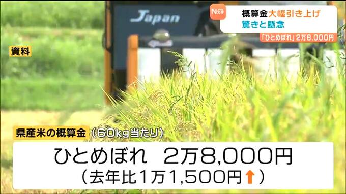 JA全農みやぎは、8月20日にコメを出荷する各農協に支払う前払い金=「概算金」を決定し「ひとめぼれ」は60キロあたり2万8000円と去年より1万1500円引き上げました。農家からは、大幅な引き上げに驚きと販売価格への影響を懸念する声が聞かれました。