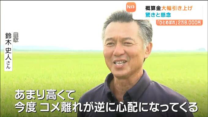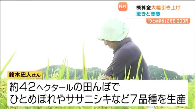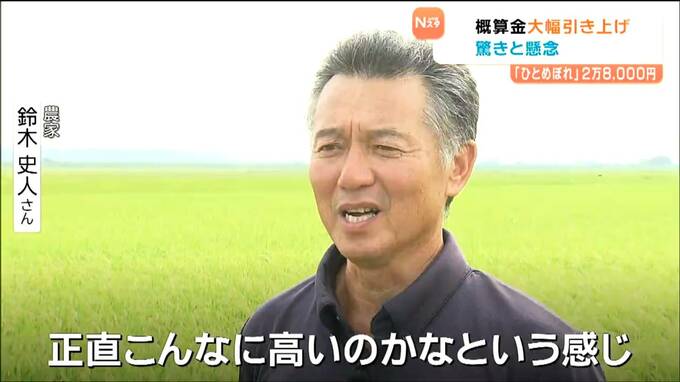 概算金の大幅な引き上げに県内の農家からは驚きと販売価格への影響を懸念する声が聞かれました。大崎市鹿島台の専業農家、鈴木史人(すずき・ふみと)さんはおよそ42ヘクタールの田んぼでひとめぼれやササニシキなど7品種を育てていてほぼ全てのコメを地元のJAに出荷しています。