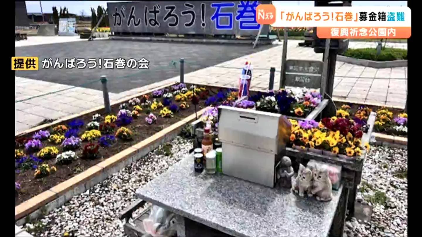 宮城県石巻市の復興祈念公園内で「がんばろう!石巻」の看板前に設置されていた募金箱が盗難の被害に遭ったことが分かりました。警察が窃盗事件として捜査しています。