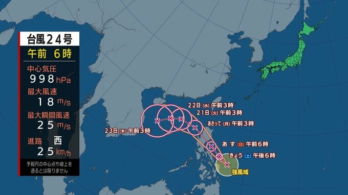 気象庁は18日午前3時、フィリピンの東で台風24号が発生したと発表しました。アジア名は「フンシェン」で中国が名付けた風神を表す言葉です。この後は西寄りに進み、フィリピンを横断して南シナ海へと向かう予想です。