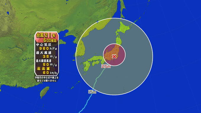 2017年10月23日午前5時時点での台風21号の進路予想図。風速15メートル以上の強風域が日本列島を覆うほどの超大型台風だった