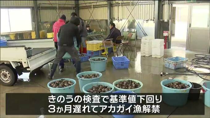 県内産のアカガイは今年8月、基準値を上回る「まひ性貝毒」が検出され今年9月1日の解禁を前に出荷が自粛されていました。しかし、6日の検査で国の基準値を下回ったことから、自粛措置が解除されアカガイ漁が3か月遅れて解禁となりました。