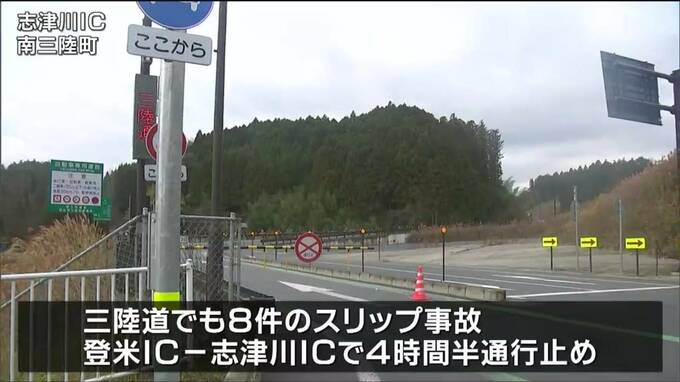 また三陸道でも▼8件のスリップ事故があり、登米ICと志津川ICの間が4時間半にわたり通行止めとなりました。