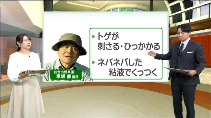 早坂園長によると、大きく分けて「トゲが刺さる・ひっかかる種類」と「ネバネバした粘液でくっつく種類」があるそうです。tbcに面白い映像が残っていました。