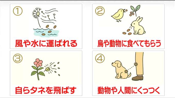 早坂園長によると、植物の種が移動する方法は、大きく分けて4つあるということなんです。