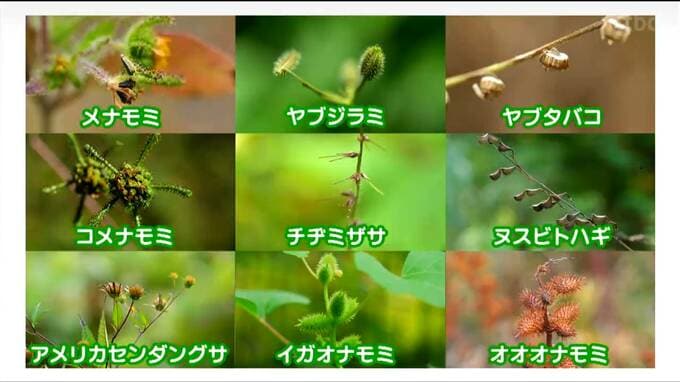 ということで、ひっつき虫とは植物を指す俗称なんですね。主なものをいくつかご覧いただきましょう。どれもひっつき虫です。見たことがあるものはありますか?