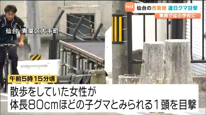 クマが目撃されたのは、仙台市青葉区大手町の路上です。22日午前5時15分頃、散歩をしていた女性が体長80cmほどの子グマとみられる1頭を目撃し、警察に通報しました。