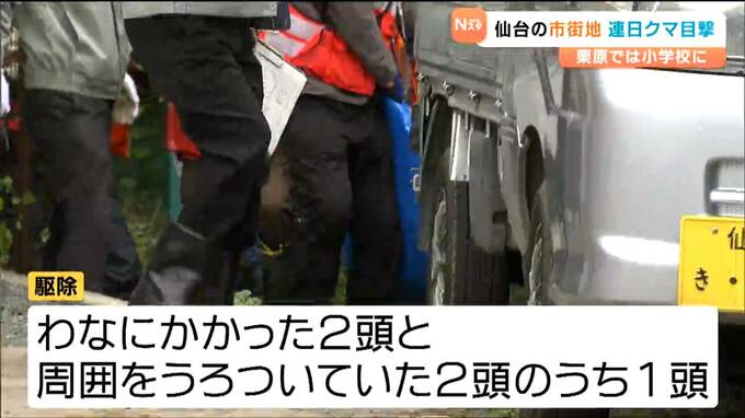 仙台市内では、21日に続き市街地でクマが目撃されたほか、わなにかかった子グマとみられる2頭と周辺をうろついていていた1頭が駆除されました。