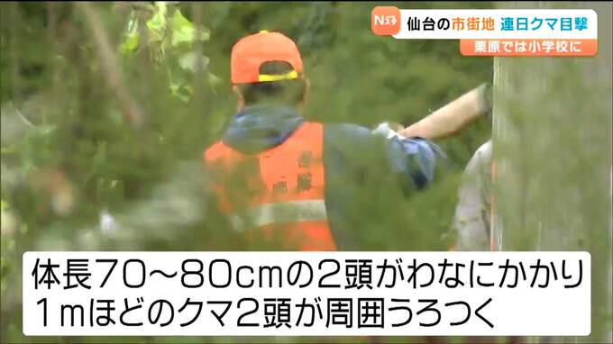 22日朝、仙台市などが確認したところ、わなにかかっていたのは、体長70cmと80cmの子グマ2頭で、体長1mほどのクマ2頭が周囲をうろついていました。