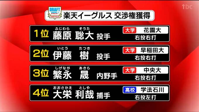 運命のドラフト会議、楽天イーグルスは京都・花園大学の藤原聡大投手を単独で1位指名しました。