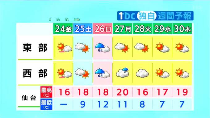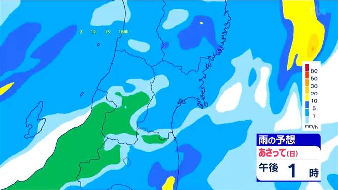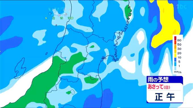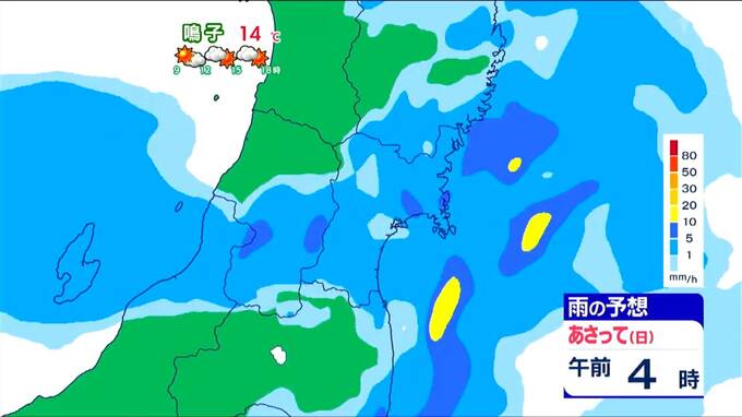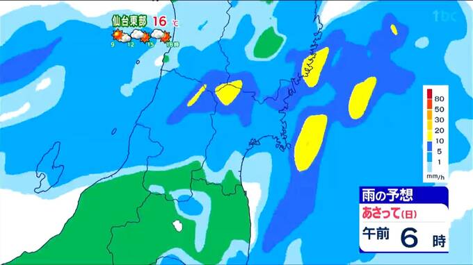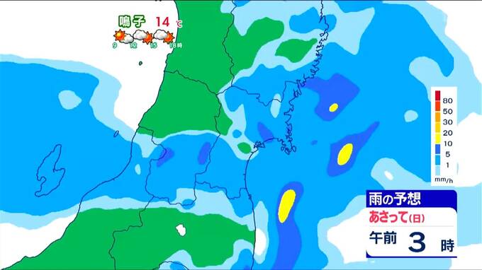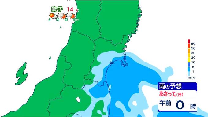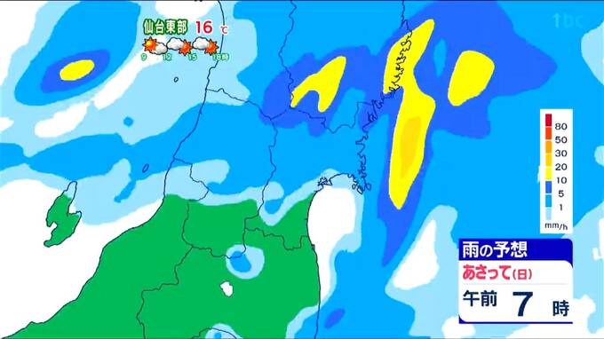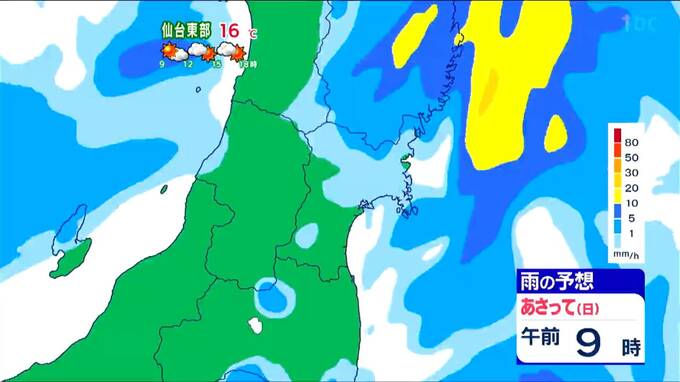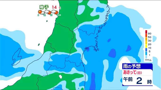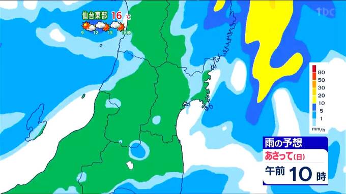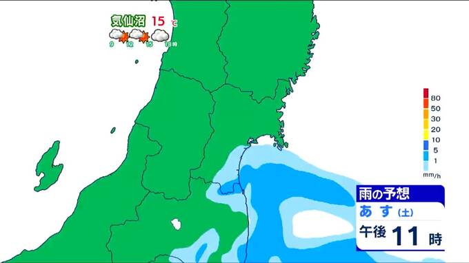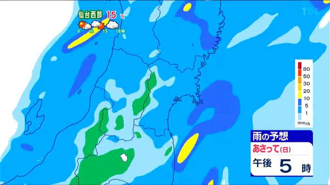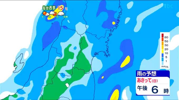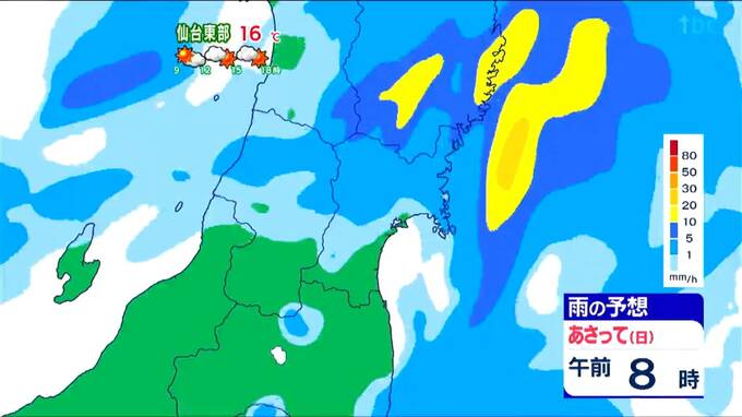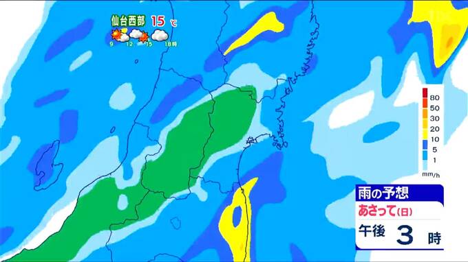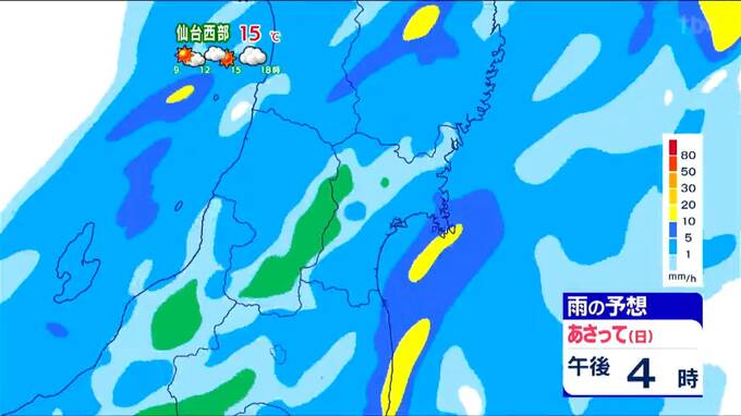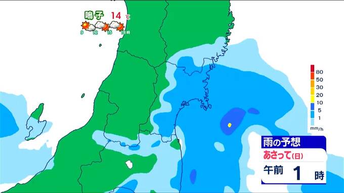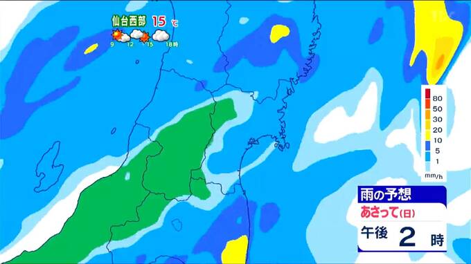 昼頃からだんだん雲が増えてきそうで、夜には仙台市東部から石巻の辺りにかけて、ごくわずかながら雨が降る可能性があります。ただし、降ったとしても狭い範囲にとどまるでしょう。