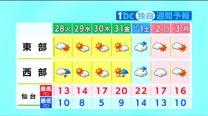 晴れ間の出る日が多いですが、土曜日は、低気圧の影響で各地で雨が降るでしょう。気温は、平年並みか高い日が多いですが、木曜の朝は気温が大きく下がり、広くこの秋一番の冷え込みとなりそうです。