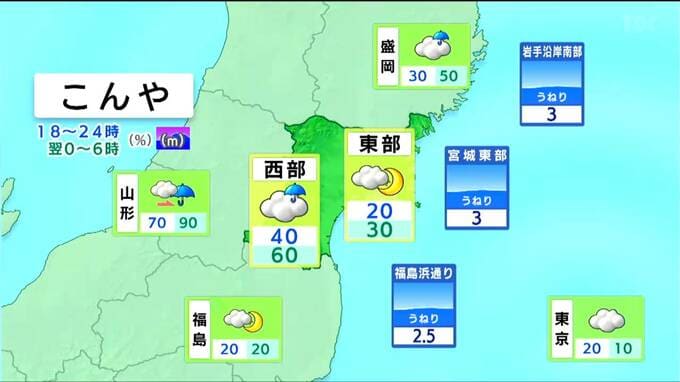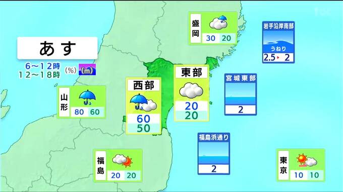 午後9時頃まで、東部では西寄りの強風に注意が必要で、海上ではうねりを伴った高波に注意してください。