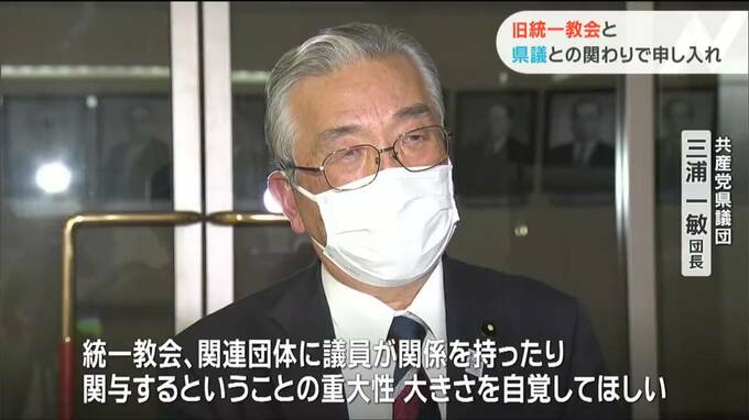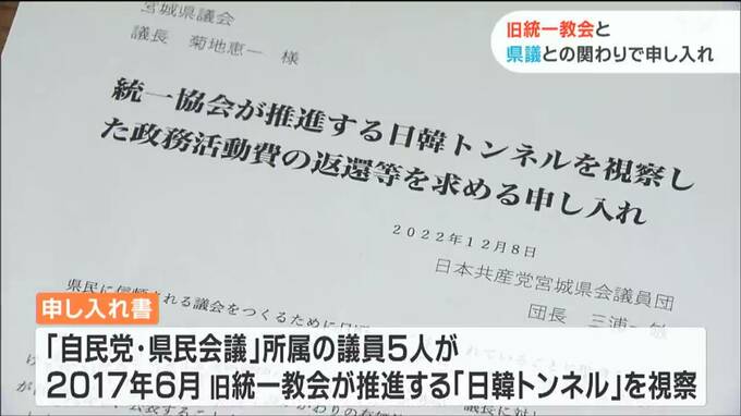 旧統一教会と宮城県議会議員の関わりを巡り、共産党県議団が8日、県議会議長に申し入れを行いました。