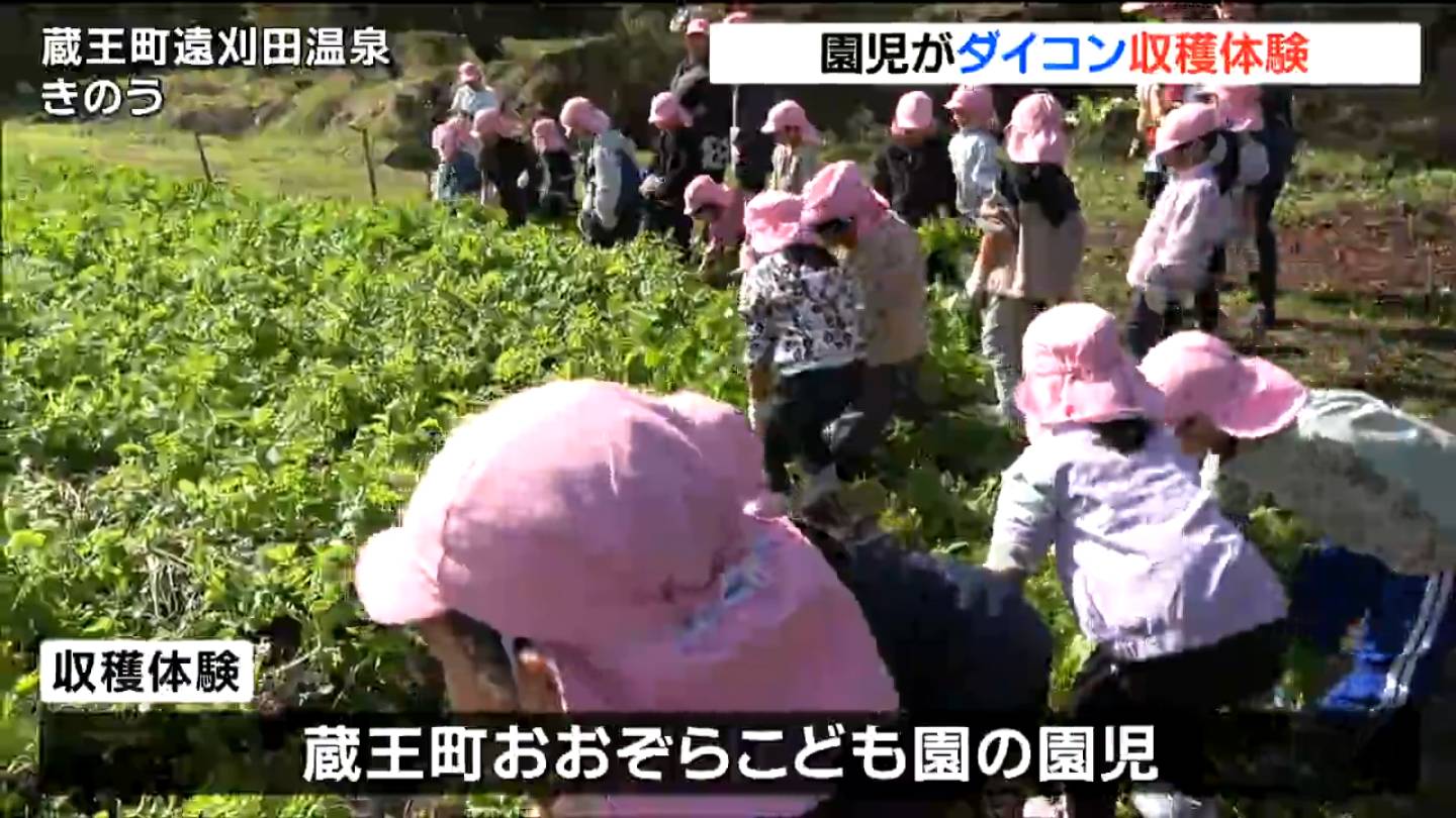宮城県蔵王町遠刈田温泉の農場で地元の園児が、ダイコンの収穫作業に挑戦しました。