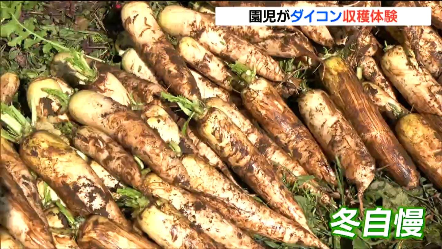 収穫したダイコンは約300本で、園に持ち帰り、給食の味噌汁に入れるなどして味わうということです。