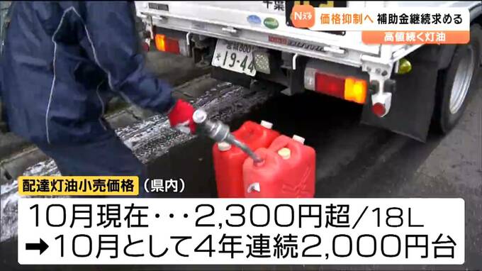 灯油は、ロシアによるウクライナ侵攻以降、高値で推移しています。宮城県生協連によりますと、宮城県内の配達灯油の10月現在の小売価格は18リットルあたり2,300円を超えていて、10月としては、4年連続で2,000円台となっています。