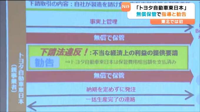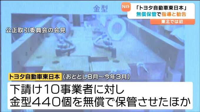 宮城県大衡村に本社がある「トヨタ自動車東日本」が2023年から2025年3月まで部品を下請け業者に無償で保管させるなどし、下請法違反にあたるとして公正取引委員会から指導と勧告を受けました。