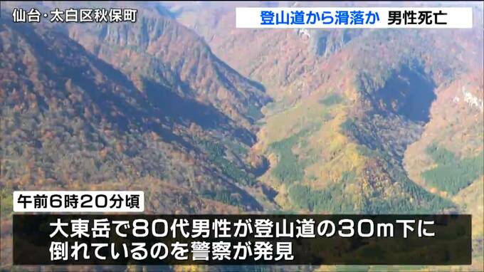 5日午前6時20分頃、仙台市太白区秋保町の大東岳で80代の男性が登山道の30メートル下に倒れているのを警察が発見しました。連絡を受けた消防が男性を救助しましたが、その場で死亡が確認されました。